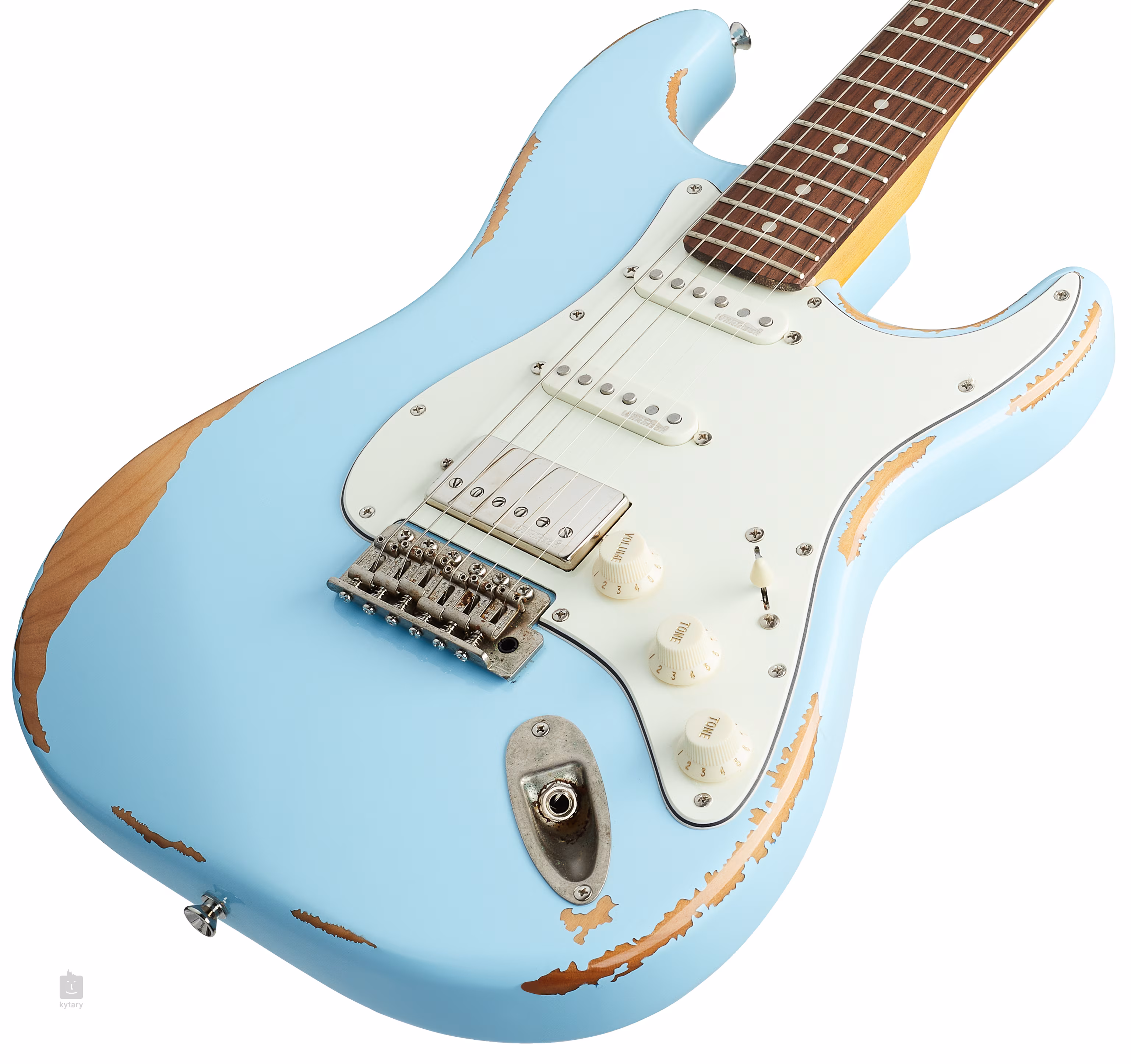 Die Vintage-E-Gitarren der ICON-Serie bieten das raffinierte Design und die Haptik von Instrumenten, die im Laufe der Jahre gespielt wurden, d.h. Oberflächen mit sowohl subtilen als auch ausgeprägten Elementen künstlicher Patina. Daher weist die V6HMRLB Stratocaster eine Reihe von Kampfspuren in Form von Kratzern, zerkratztem Lack und ausgeprägten Patina-Elementen an der gesamten Hardware auf.
