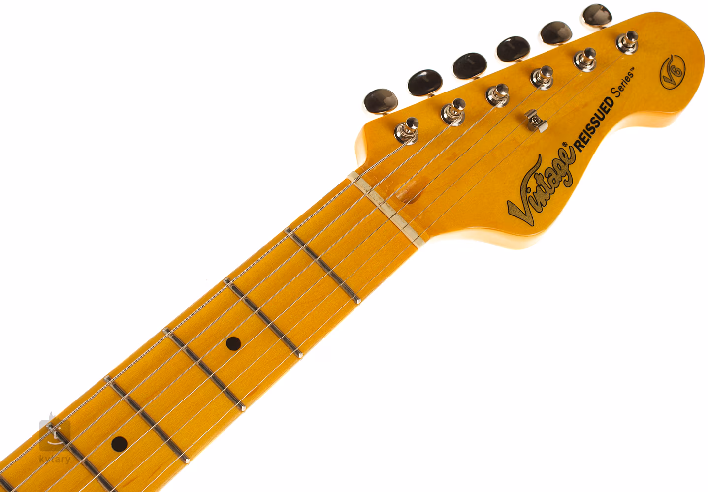 Die Vintage V6MSSB ist eine stilvolle E-Gitarre im Double-Cut-Design der ST-Modelle aus der Vintage Reissued Series. Der Korpus des Instruments ist aus Erle gefertigt. Der Ahornhals bietet ein schönes "Soft C"-Profil, und das Griffbrett ist durch zweiundzwanzig mittelgroße Bünde unterteilt.