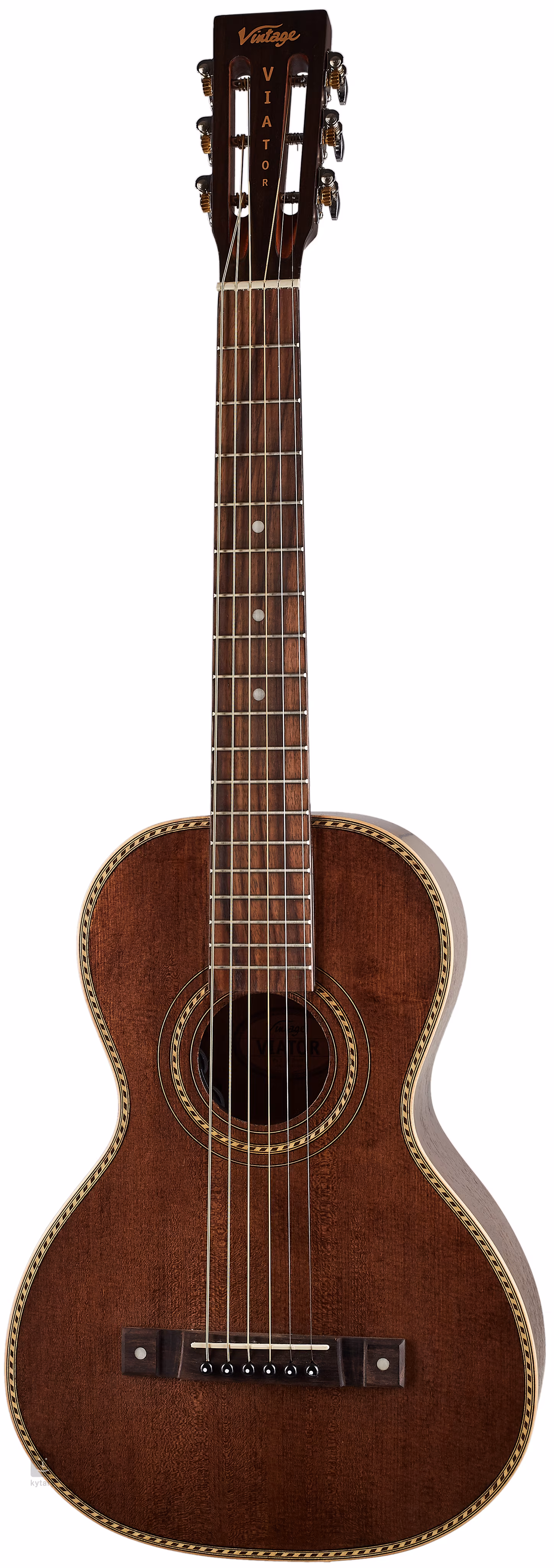 Das Soundsystem wird von der erstklassigen Fishman Sonitone-Elektronik mit einem Piezo-Tonabnehmer unter der Glocke sowie Lautstärke- und Tonreglern übernommen, die sich im Schallloch befinden, so dass sie das elegante Aussehen des Instruments nicht beeinträchtigen. Ein netter Bonus ist der USB-Ausgang, so dass Sie die Gitarre einfach direkt an Ihren Computer oder andere Geräte anschließen können. Die Gitarre wird in einem gepolsterten Koffer mit dem Vintage-Logo geliefert.