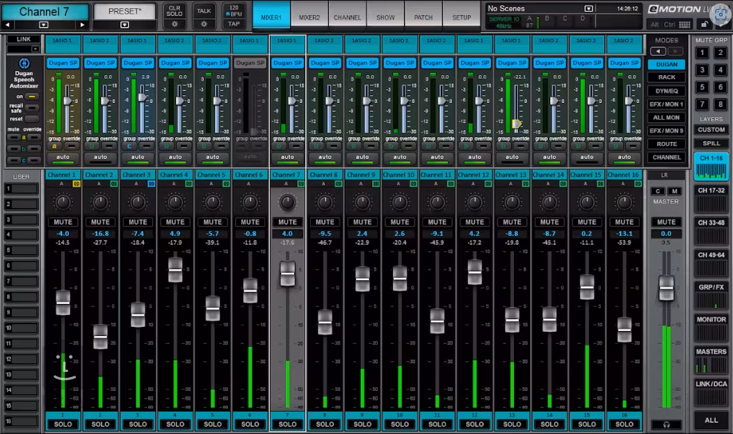Dugan Speech ist ein Waves-Plugin, das die Pegel von bis zu 64 Mikrofonen automatisch steuert. Es ist ideal für Podiumsdiskussionen, Firmenveranstaltungen und andere Anwendungen, bei denen viele Mikrofonsignale gleichzeitig verarbeitet werden müssen. Das Plugin reduziert effektiv das Risiko von Rückkopplungen und kombinatorischen Filtern und verbessert die Klarheit des Dialogs, indem es automatisch den Pegel anderer Mikrofone zugunsten des aktuellen Sprechers reduziert.