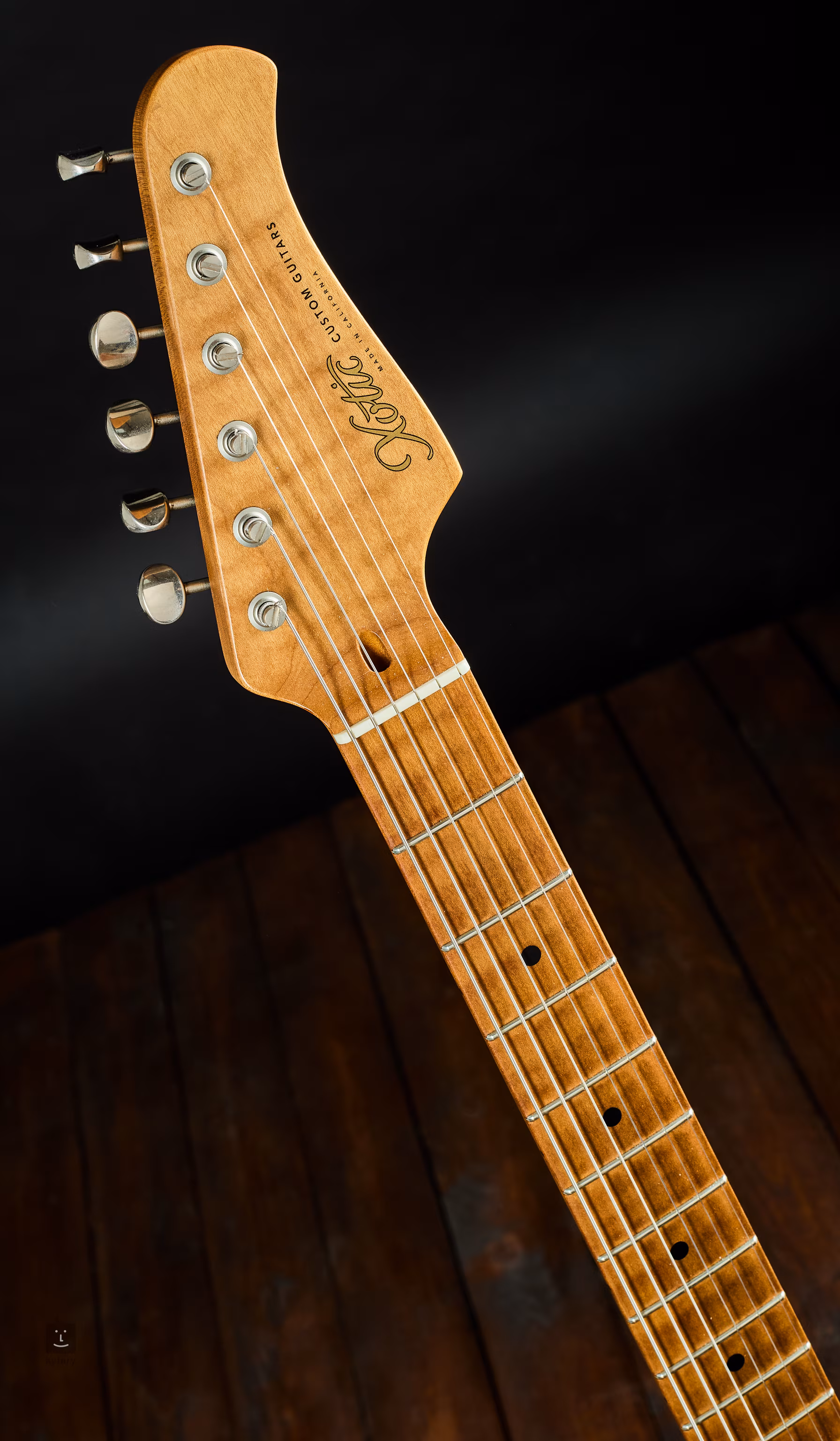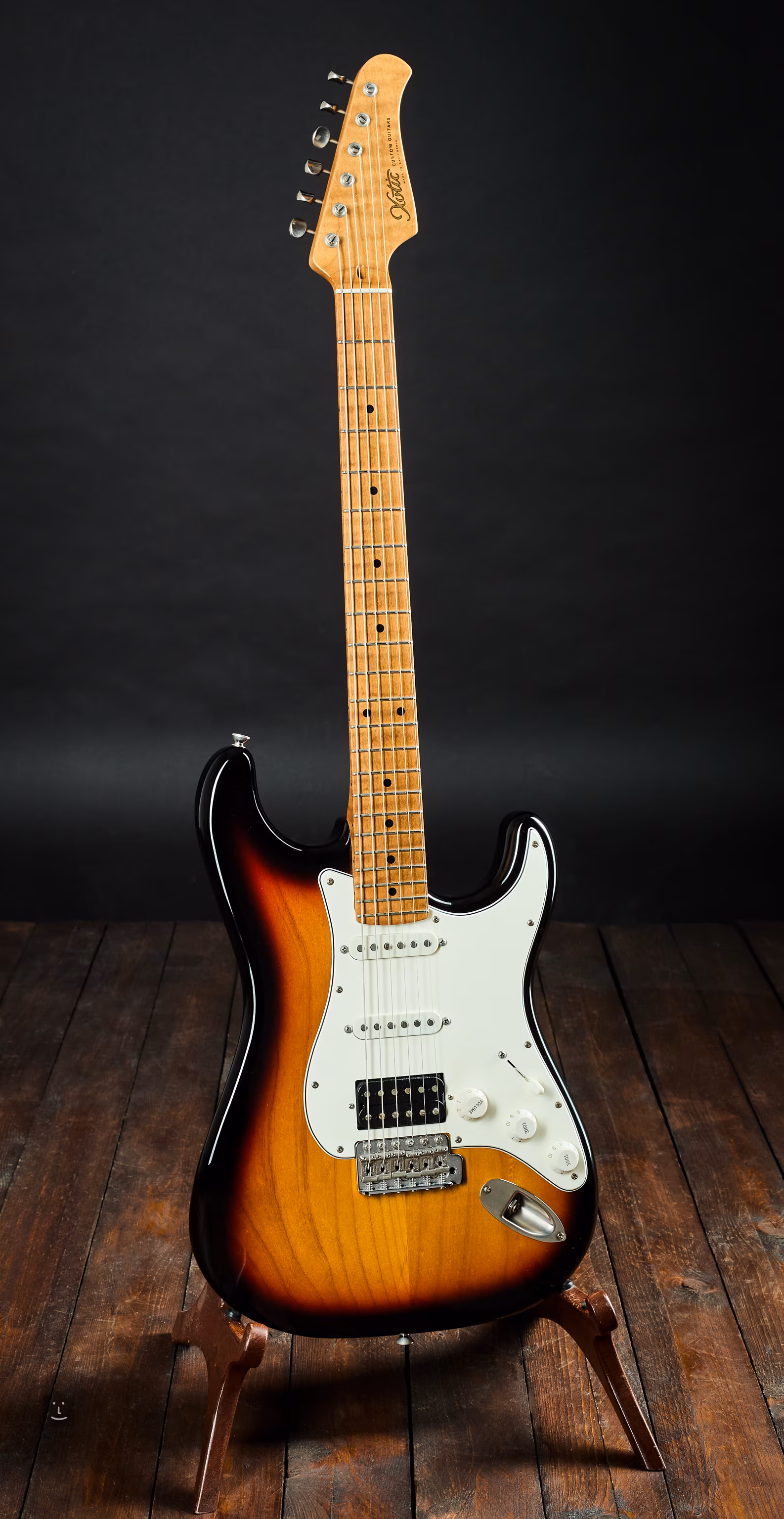 HSS Strat von der kalifornischen Marke Xotic. Ahorn gebacken (geröstet) Kek ist mit einem Esche Körper verbunden. Die Tonabnehmer sind 2 Xotic RV-50 Singles und ein Xotic RV-50PAF Humbucker.