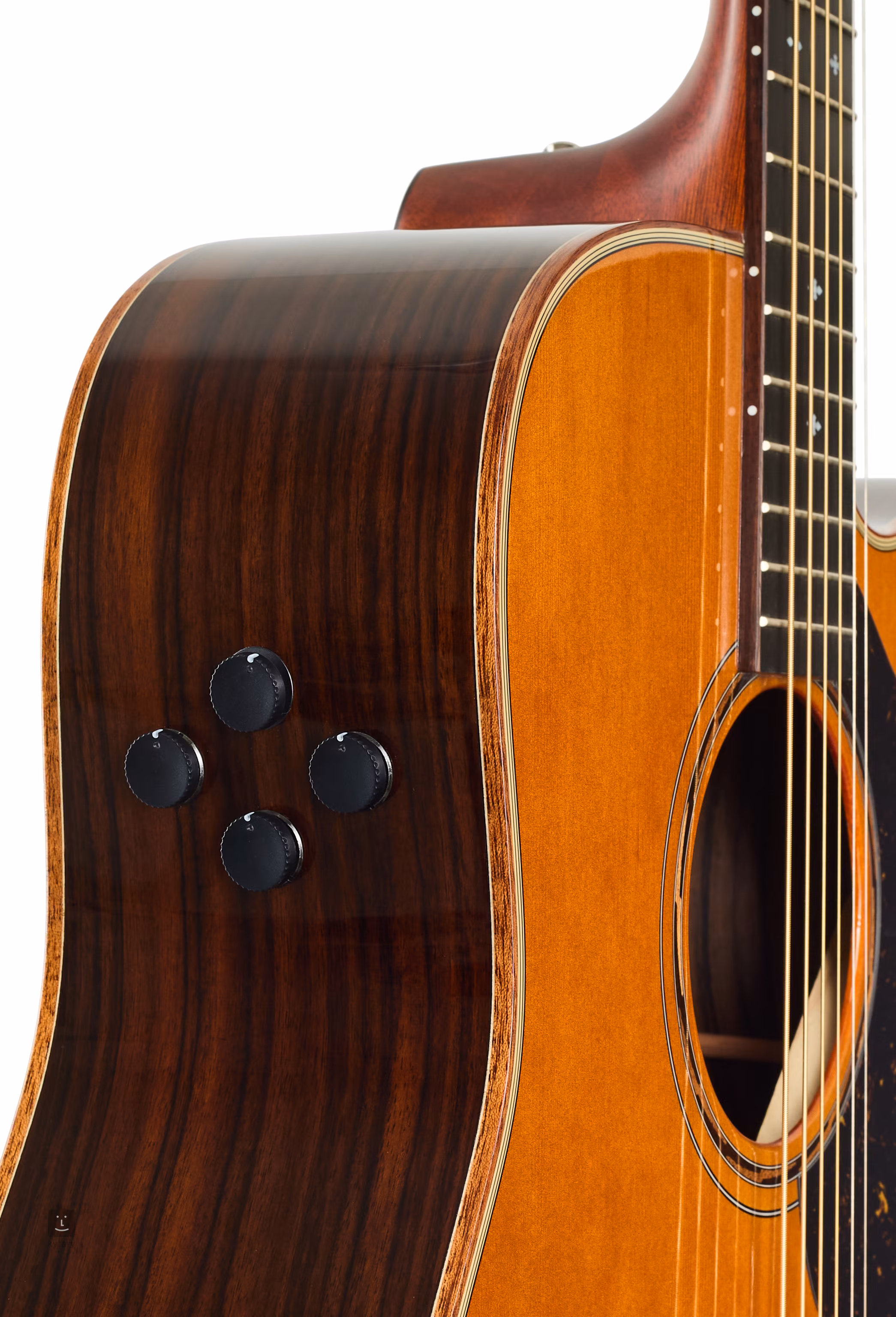 Die A5-Serie steht für qualitativ hochwertige Instrumente, die von erfahrenen japanischen Gitarrenbauern hergestellt werden. Die Frontplatte der A5R ARE VNT-Gitarre besteht aus massivem Sitka-Fichtenholz, das vor dem Zusammenbau einer A.R.E.-Technologie (Acoustic Resonance Enhancement) auf molekularer Ebene unterzogen wurde. Durch die präzise Kontrolle von Temperatur, Feuchtigkeit und Luftdruck erreicht das Holz akustische Eigenschaften, die mit denen eines Instruments vergleichbar sind, das viele Jahre lang aktiv gespielt wurde. Sie bekommen eine Gitarre mit "gewonnenem" Holz in die Hand.