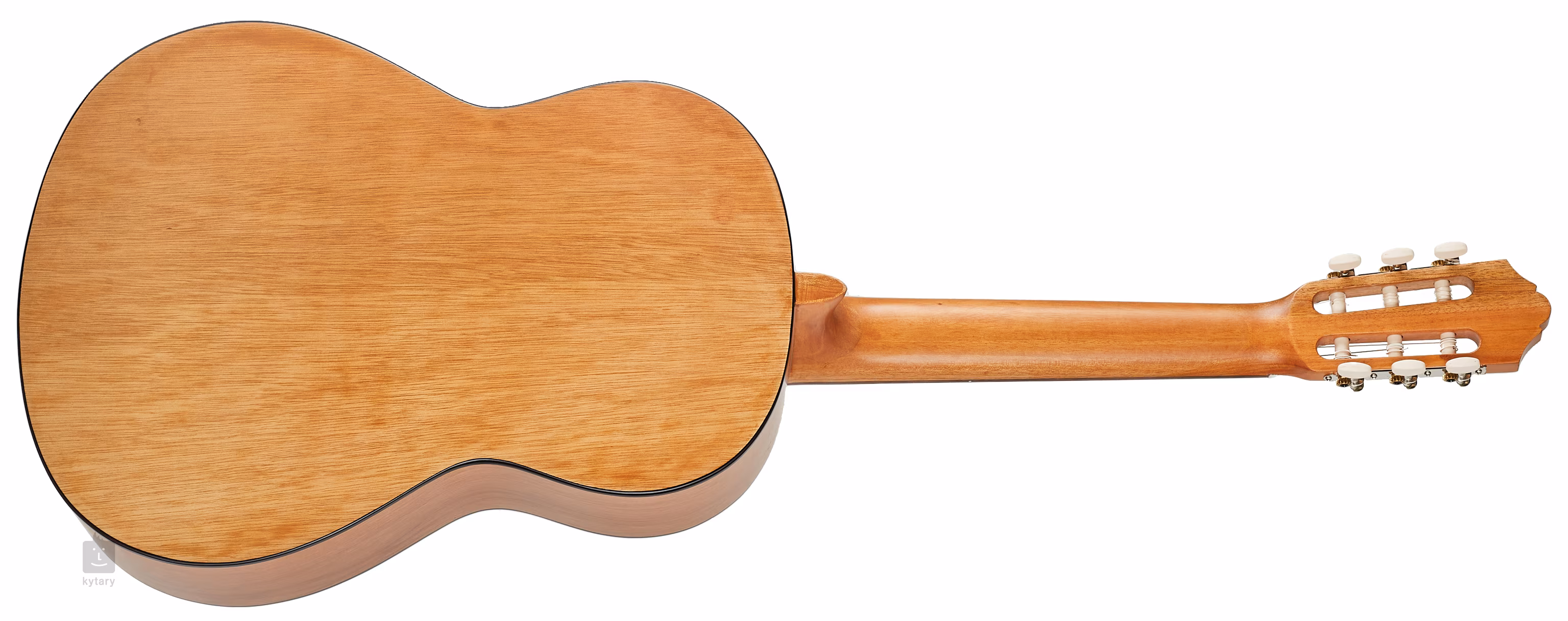 Diese klassische Gitarre eignet sich für Kunstgrundschulen, deren Schüler und angehende Musiker. Das Instrument hat eine Fichtendecke, Boden und Zargen aus Meranti und einen Nato-Hals. Griffbrett und Saitenhalter sind standardmäßig aus Palisander.