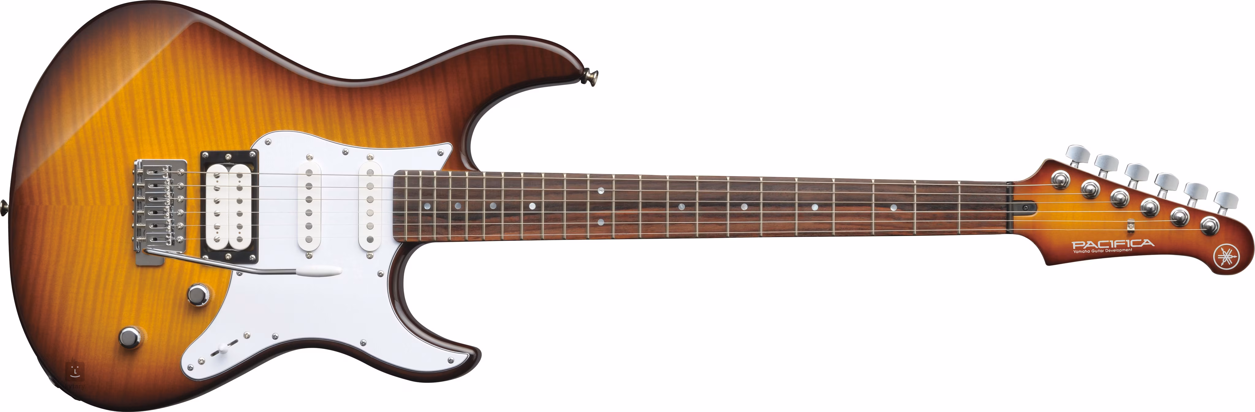 Der Erle-Korpus der Pacifica 212VFM Tobacco Brown Sunburst E-Gitarre ist mit einem spektakulären geflammten Ahorn-Deckenfurnier und glänzendem Polyurethan-Lack verziert. Der Ahornhals ist auf ein Palisandergriffbrett mit zweiundzwanzig Medium-Bünden geleimt. Das "Medium C"-Halsprofil, der flachere Griffbrettradius und die Aussparungen im Korpus sorgen für eine komfortable Bewegung und Anpassung über das gesamte Griffbrett.