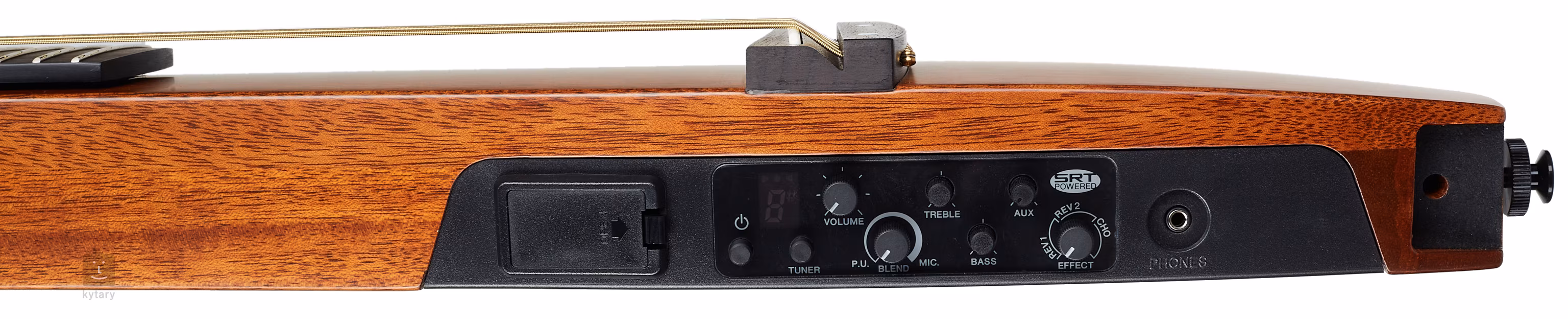 Die aktive Elektronik von SRT Powered, die in den Korpus der Gitarre eingebaut ist, simuliert originalgetreu die natürliche Resonanz von akustischen Gitarrenkörpern (Mikrofon-Tonabnehmer). Dank des Underdrive-Piezo-Tonabnehmers können Sie außerdem zwischen einem reinen Piezo-Tonabnehmer, einem SRT-Tonabnehmer und einer Mischung aus beidem wählen. Viele werden sich auch über die bereits erwähnten eingebauten Effekte (zwei Arten von Reverb und Chorus), den Aux-Eingang mit Lautstärkeregler für den externen Audioeingang und das eingebaute Stimmgerät freuen.