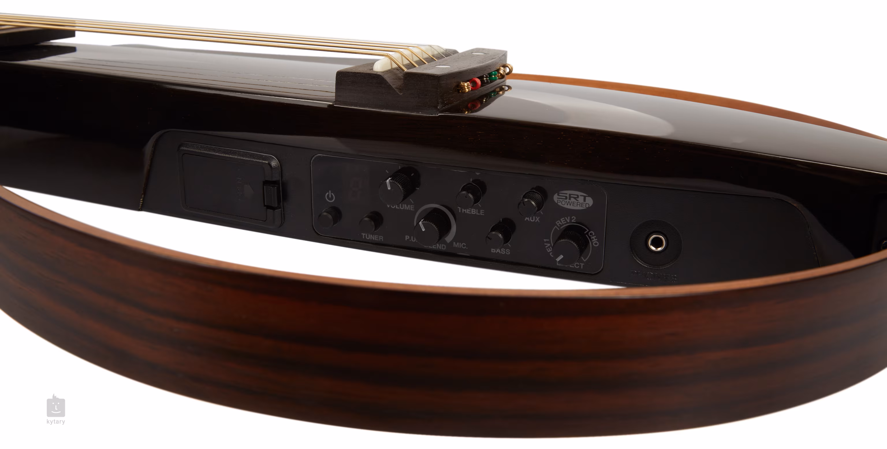 Die aktive Elektronik von SRT Powered, die in den Korpus der Gitarre eingebaut ist, simuliert originalgetreu die natürliche Resonanz von akustischen Gitarrenkörpern (Mikrofon-Tonabnehmer). Dank des Underdrive-Piezo-Tonabnehmers können Sie außerdem zwischen einem reinen Piezo-Tonabnehmer, einem SRT-Tonabnehmer und einer Mischung aus beidem wählen. Viele werden sich auch über die bereits erwähnten eingebauten Effekte (zwei Arten von Reverb und Chorus), den Aux-Eingang mit Lautstärkeregler für den externen Audioeingang und das eingebaute Stimmgerät freuen.