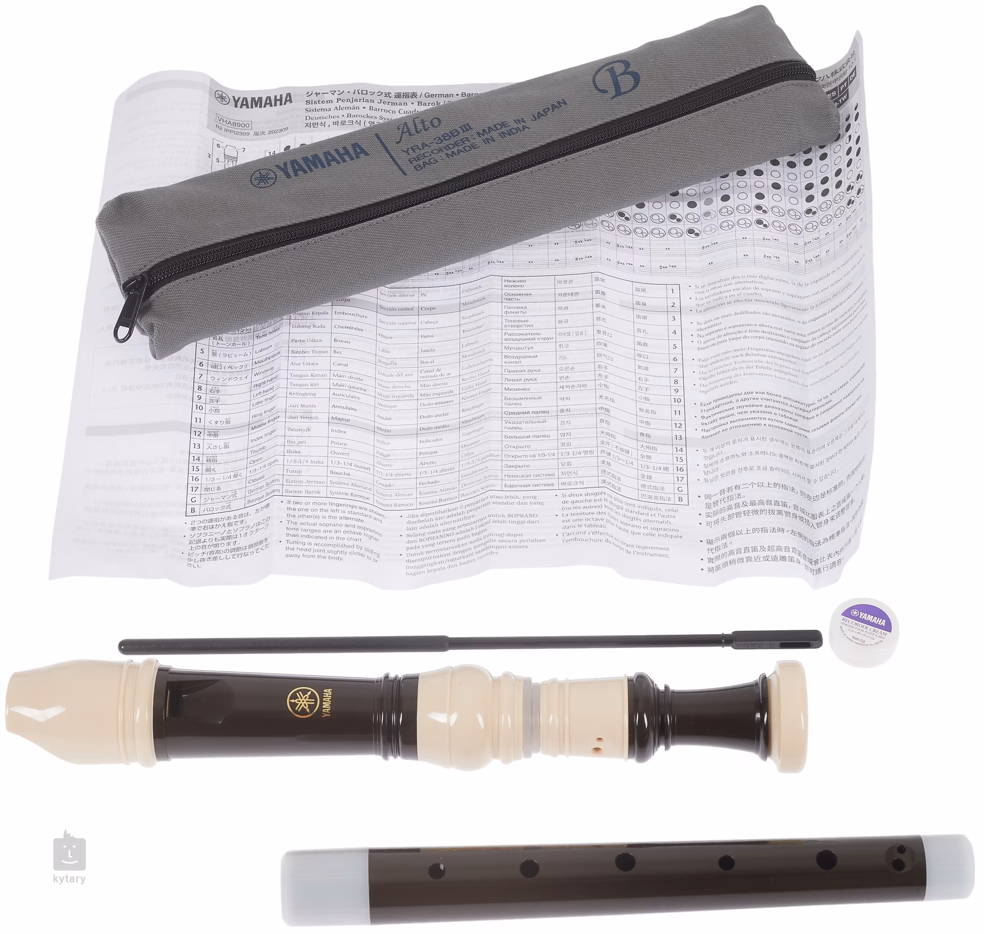 Die Flöten werden in einem Baumwolletui zusammen mit einer Grifftabelle, einem Plektrum und Schmiermittel geliefert.