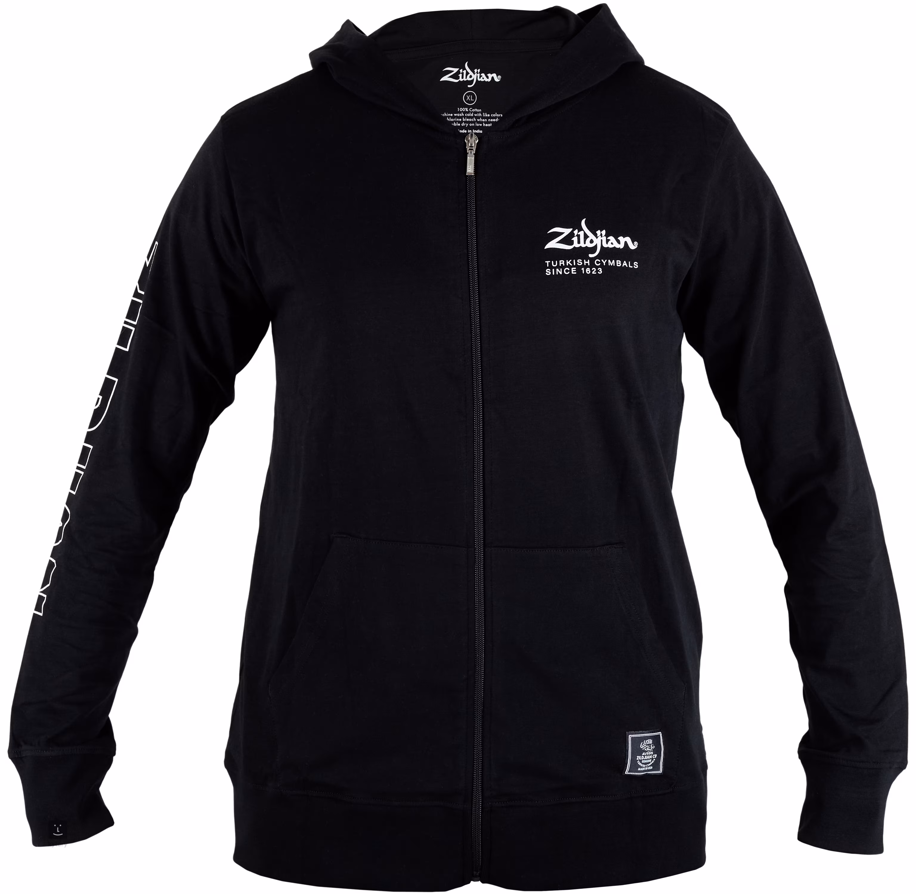 Das Design in Schwarz wird durch das auffällige Zildjian-Logo auf der linken Brustseite und den markanten Blockbuchstaben-Schriftzug „Zildjian“ entlang des rechten Ärmels ergänzt. Praktisch sind auch die geräumigen Fronttaschen, in denen Sie Ihre Hände wärmen oder Kleinigkeiten verstauen können. Ein Detail in Form eines gewebten Aufnähers mit dem Zildjian-Logo auf der Fronttasche unterstreicht den authentischen Charakter der Marke.