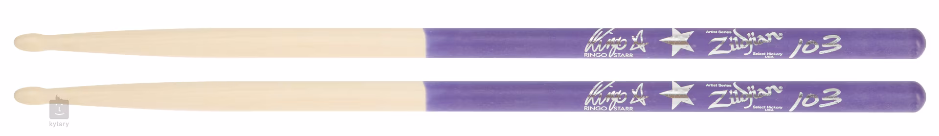 Die Stöcke messen 406 mm. Die Spitze hat eine länglich-ovale Form und ist aus Holz gefertigt, der Griff des Drumsticks ist mit lila DIP überzogen.